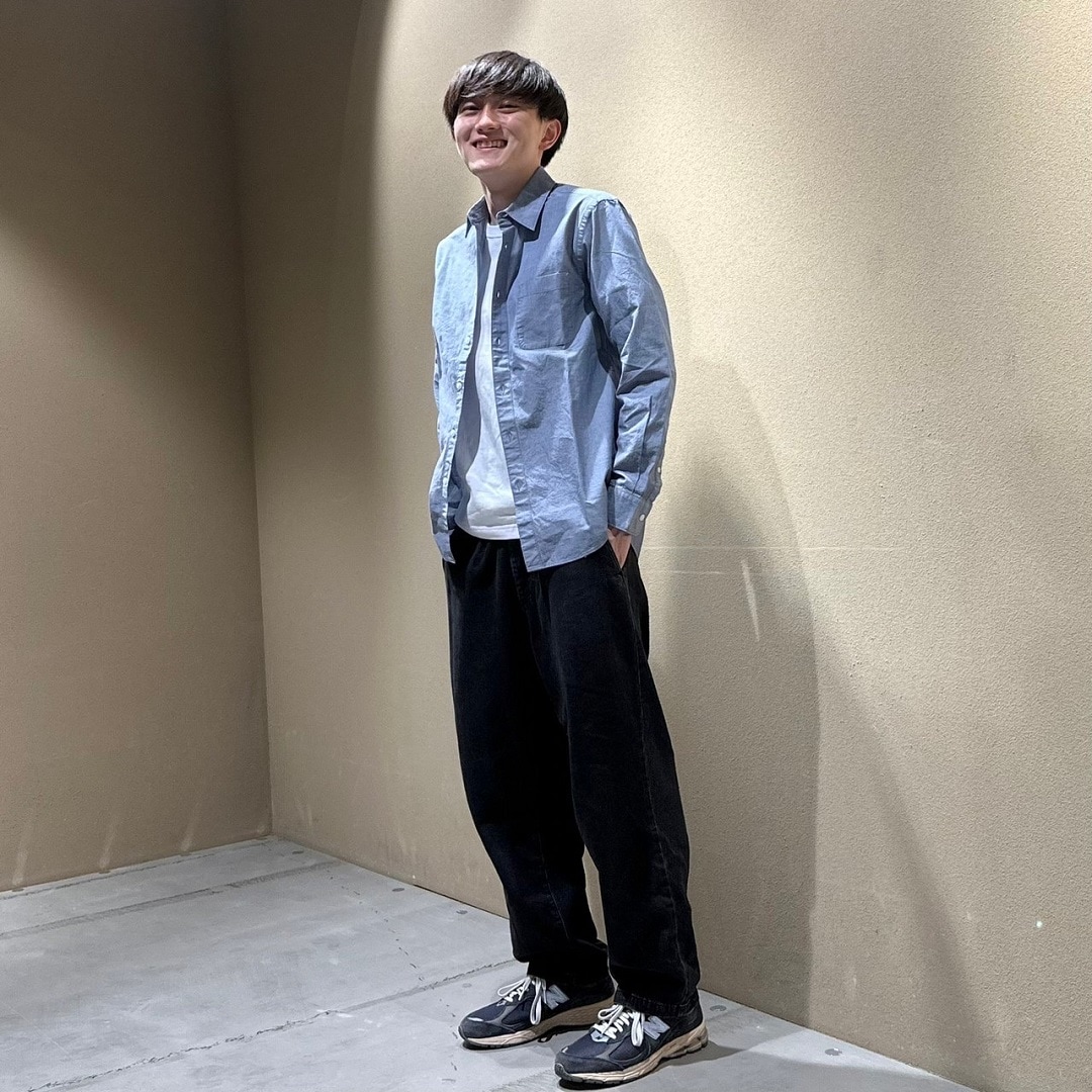 肌馴染みのいいブロード生地のシャツに黒のデニムを合わせたコーデ。トップスのブロードシャツは若干の艶感と、動きやすく着心地の良いフィット感とシルエットが特徴で、ベーシックな色から季節を感じる色を取り揃えています。