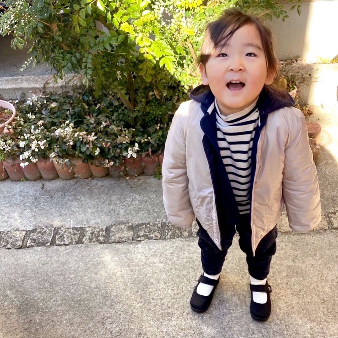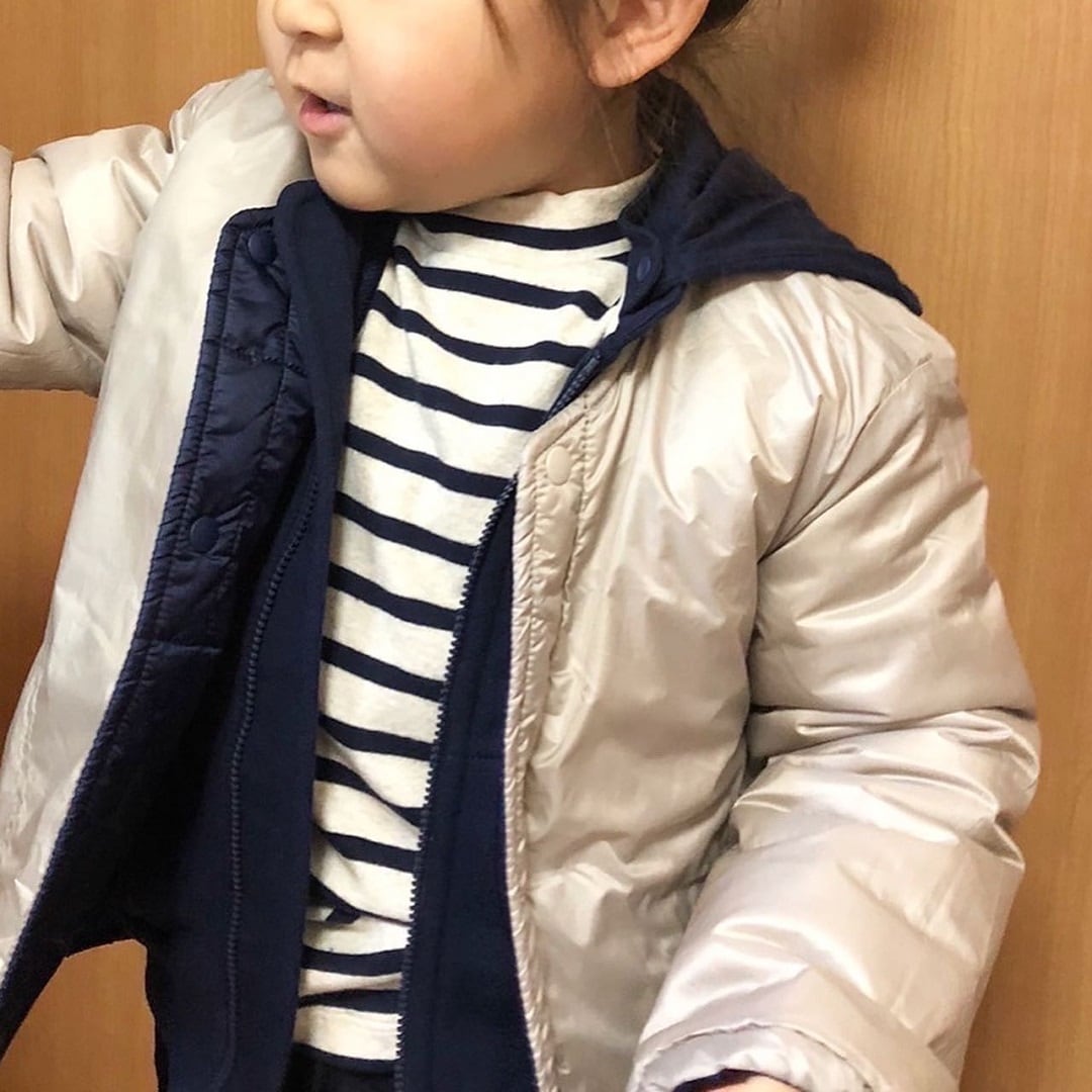 まだまだ寒い今の時期に重宝する中わたのリバーシブルジャケット。モデルはベージュバージョンで着用していますが、裏返すとネイビーに早変わりします。
