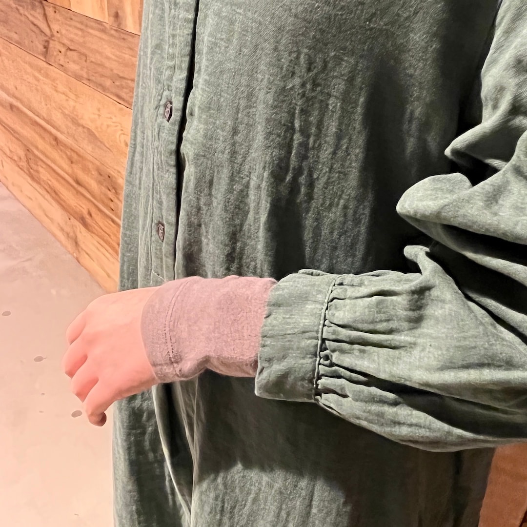 着用商品:カポック混二重ガーゼ 長袖ワンピース 婦人 L・スモーキーグリーン 軽い素材カポックの入った、柔らかいガーゼのワンピースです。今の時期は中に違う色のタートルネックを着ることでコーディネートを楽しむことができます。背中にはたっぷりギャザーがあるので、見た目も着心地もリラックスできます。落ち着いた配色のアースカラーコーデもカポックの風合いで、軽やかです。
