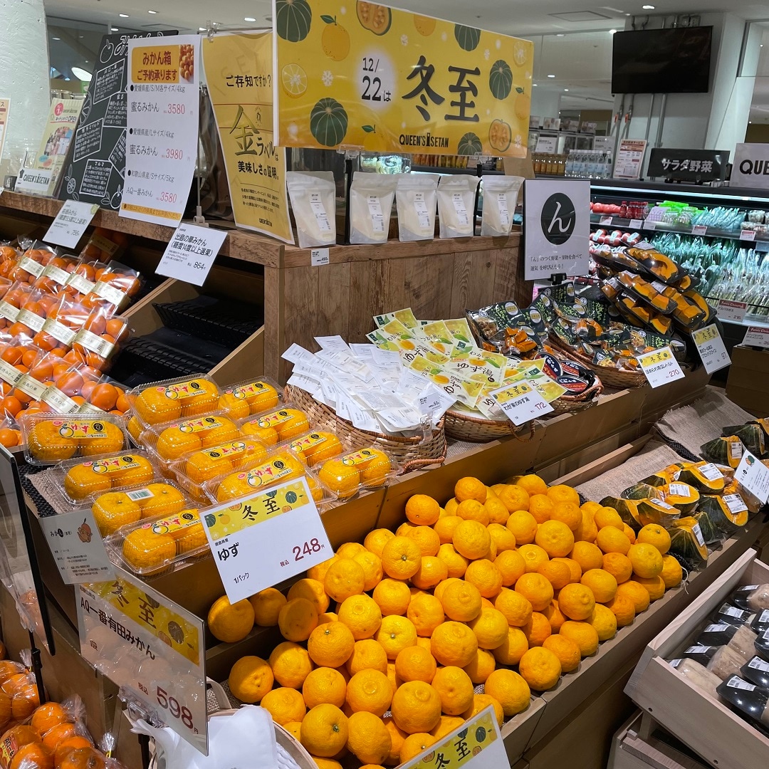 無印良品 港南台バーズ内のクイーンズ伊勢丹、青果コーナーでも、柚子をはじめとした冬至に縁起の良い食材が多く並んでいます。