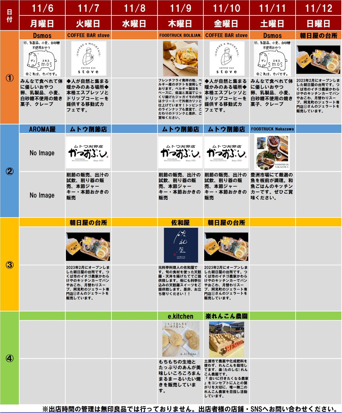 出店の時間に関しては、各出展者様のSNS等をご確認下さい。