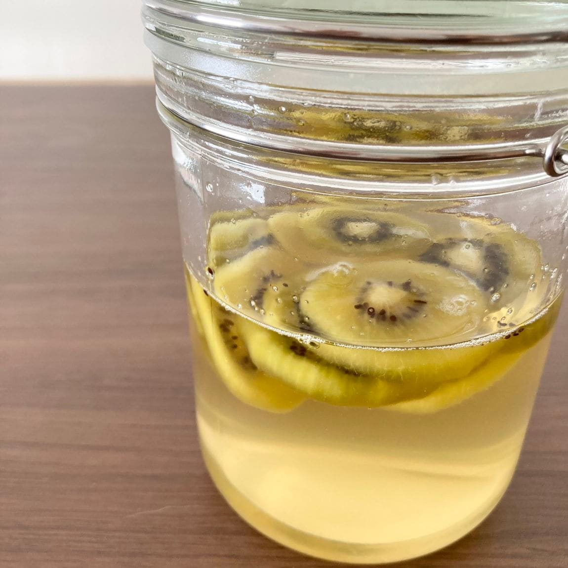 冷暗所で保管し、1日1回ほどフタをしたままで軽く振り混ぜます。1週間後にキウイを取り除いたら、冷蔵庫で保管してください。(取り出したキウイもおいしいので、ヨーグルトなどに混ぜてぜひ食べましょう。)