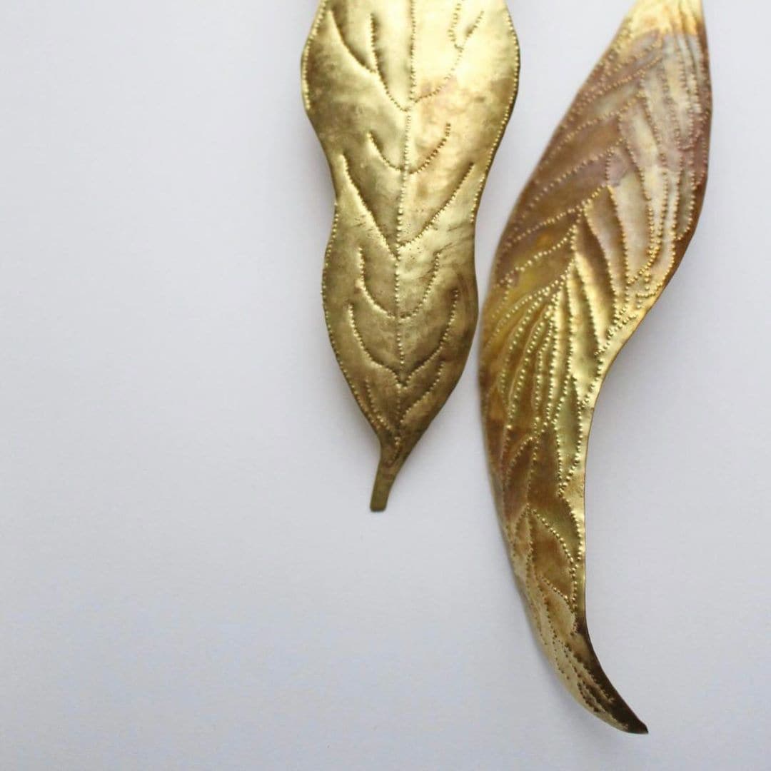 真鍮の板から好きな葉形を切り取り、線「-」と点「・」の鏨(たがね)を使って葉の模様を打ち描きます。