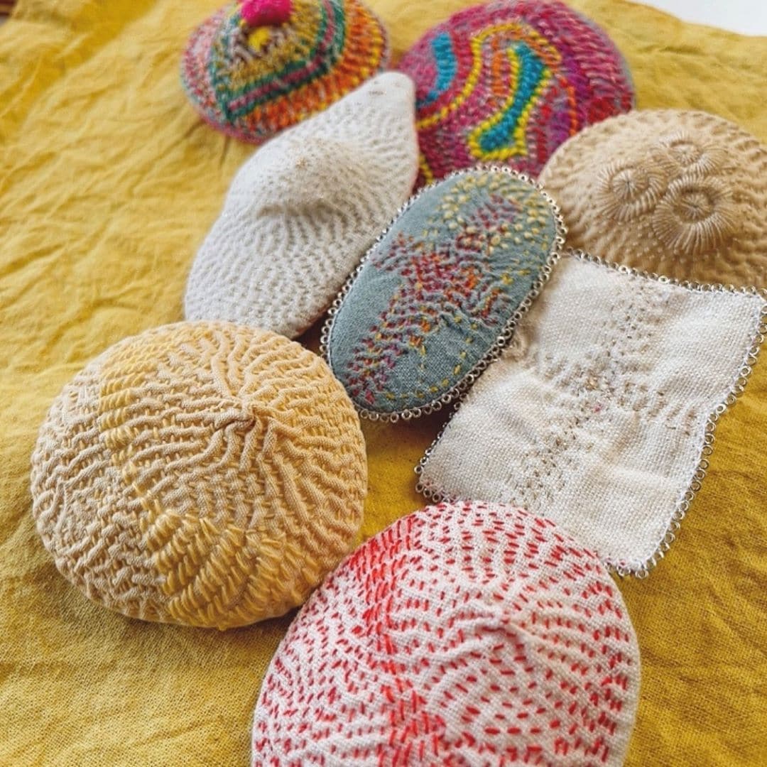 穴あきのニットや靴下、すりきれた衣類など馴染ませるように繕ったり、糸やカラーを楽しんでカラフルに繕うなど、自由度の高い修繕です。ご自身やご家族の衣類をお持ちになり、色とりどりの毛糸などでダーニングをお楽しみいただけます。