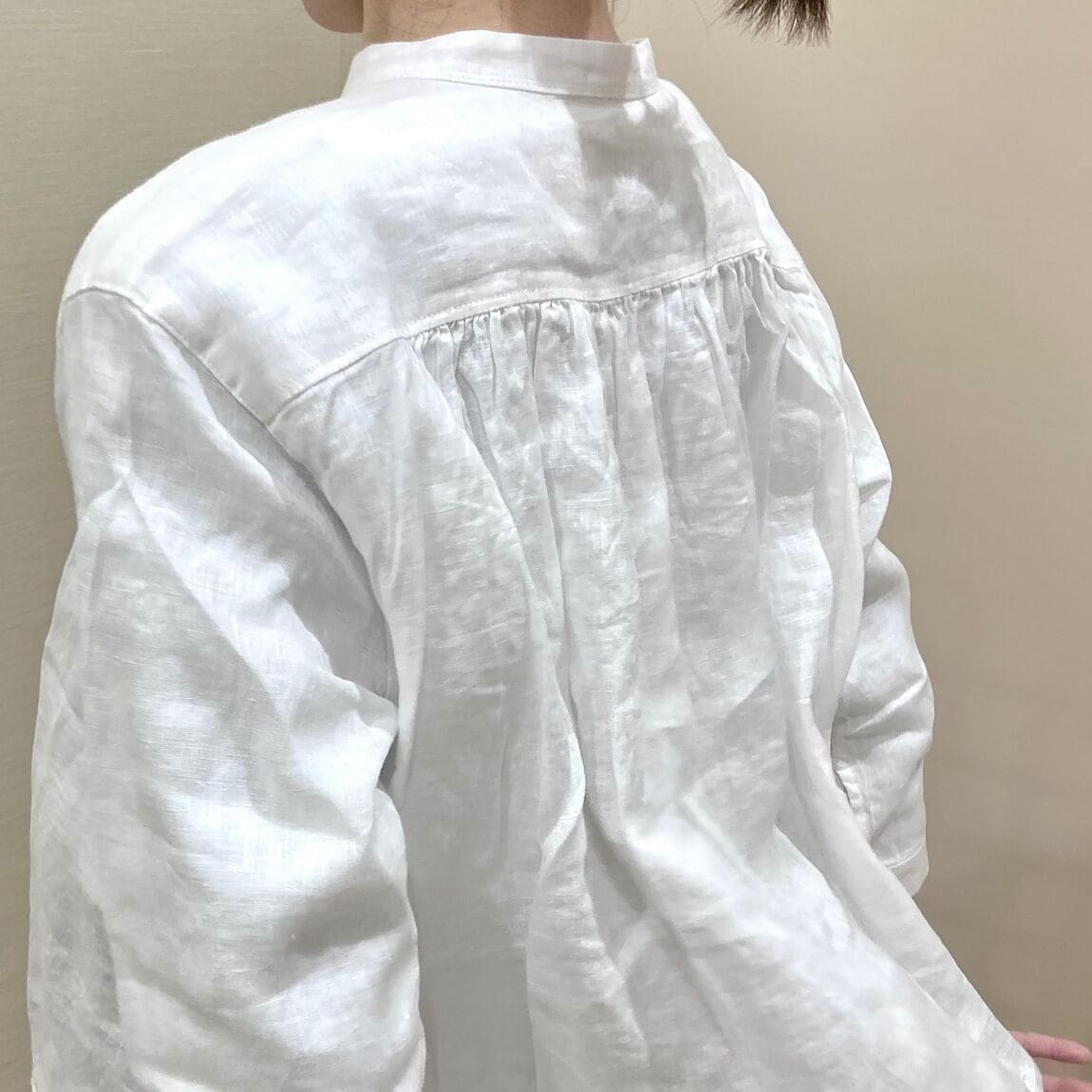 スタンドカラーのすっきりとしたデザインに、後ろにはギャザー施すことで、ゆったりと着られる女性らしいAラインシルエットに仕上げました。