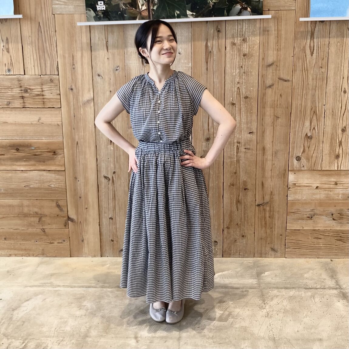 同素材のブラウスとのセットアップもおすすめですが、今回はワンピース風にコーディネートしてみました。