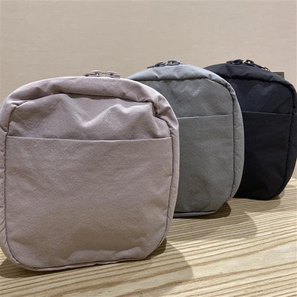 独特のシワとハリ感が特長のナイロン生地を使ったポーチです。 メイクポーチとしても使えて、内側にはブラシなどを立てて入れられるポケットがついています。