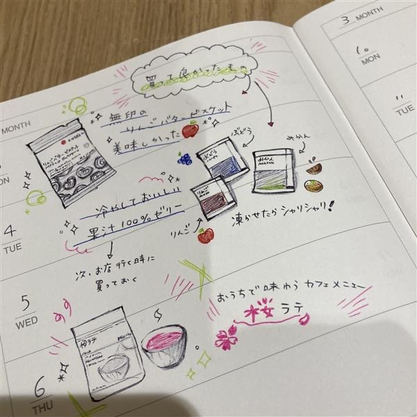 予定を書き込む他に、ちょっとしたメモ、一言日記、ToDoリスト、簡単ならくがき帳、買ってよかったものリスト。