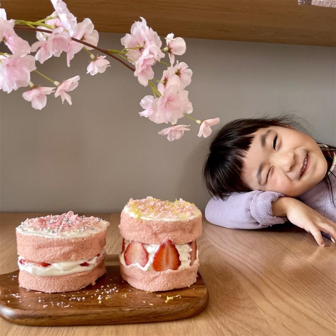 今回は桜のロールケーキを使って、春らしいイメージのケーキが出来ました。