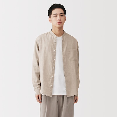 リネン洗いざらしスタンドカラー長袖シャツ