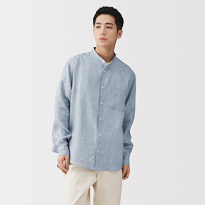 紳士 リネン洗いざらしスタンドカラー長袖シャツ 紳士L・ライトブルー