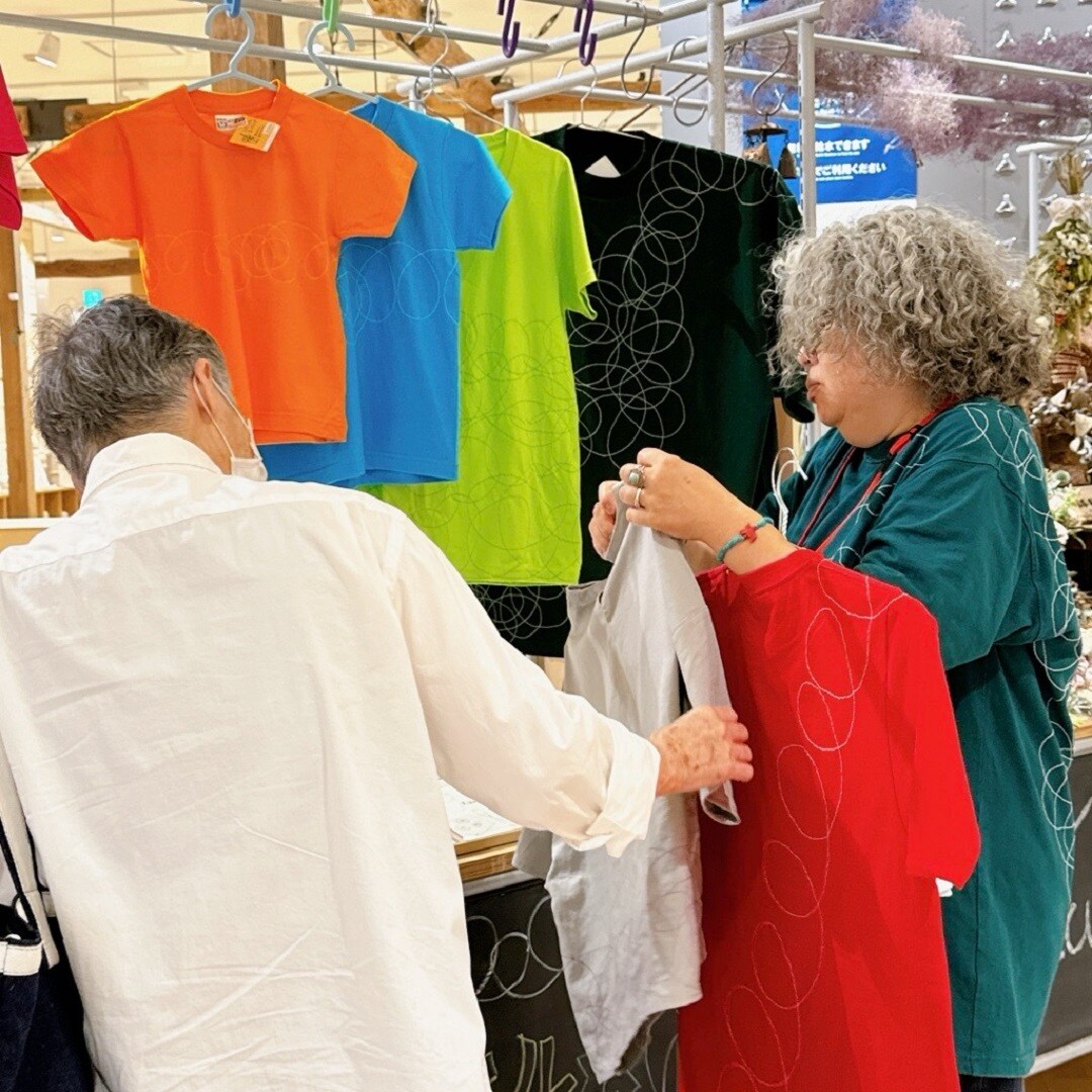 みなさんに夏の始まりと共に楽しんでいただけたらとぐるぐると描かれたTシャツとプルオーバー、そしてお馴染みのクロスやトートバックなどお持ちいただきましたよ。