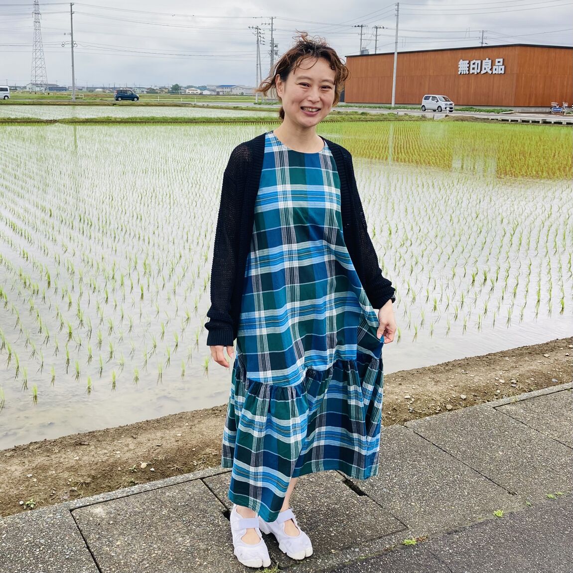 燕スタッフ 身長:159cm 『マドラスチェック スリーブレスワンピース』と『ヘンプ混メッシュVネックカーディガン』 を合わせた夏らしいコーディネートです。