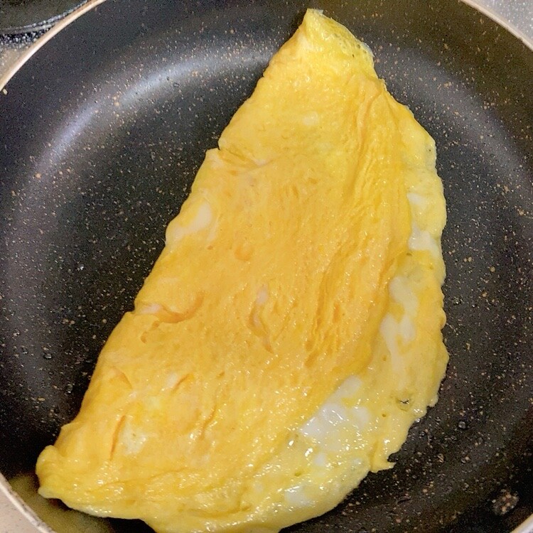 中火に熱したフライパンに溶き卵を入れて、オムレツのように焼きます。