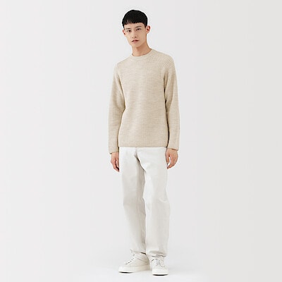 トップスは、ミリタリーデザインから着想を得たクルーネックセーターで、肘に施したエルボーパッチがアクセントです。ひじ部分をあて布で補強し、摩耗や毛玉を抑えて永く着用いただけます。