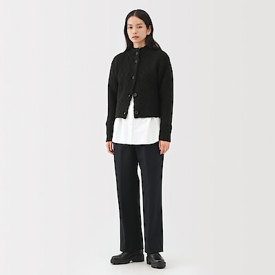 トップスは、ハイネックの衿に少し短めの着丈のカーディガンです。羽織としても、セーターのように1枚着でも。ボタンの留める位置で印象も変わります。