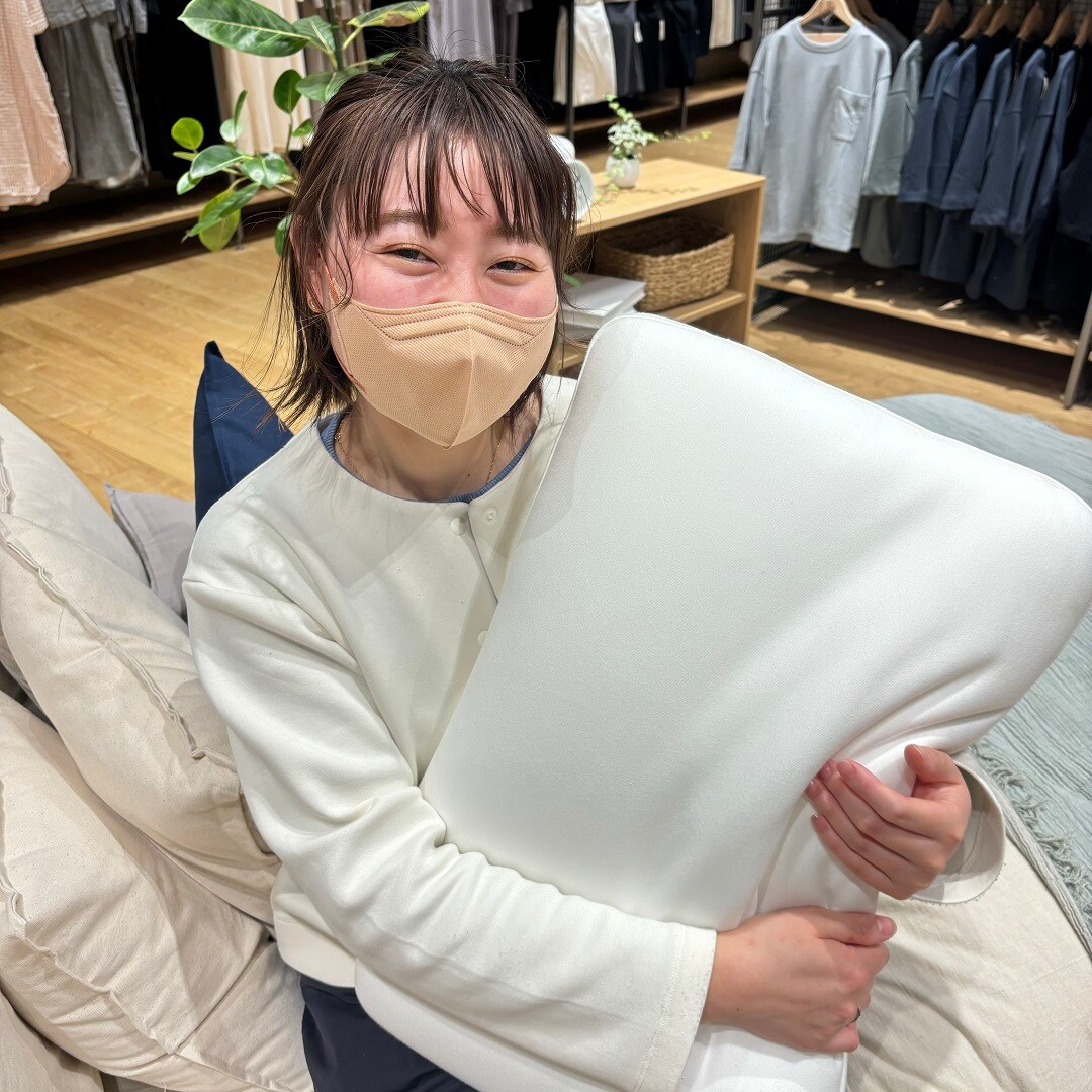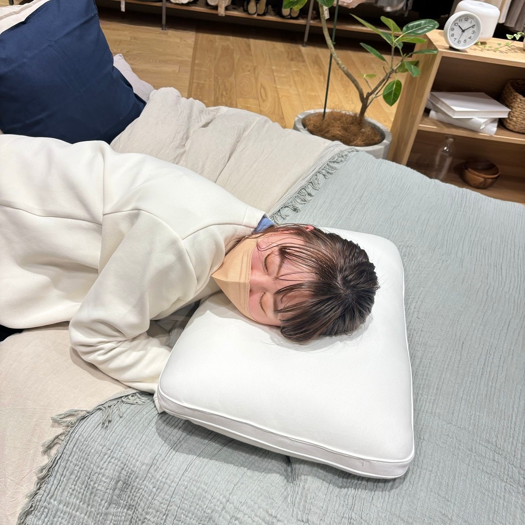 「私これもうずっと前から使っているんですよ。何年目だろう。もちもちしててやわらかいけど、自然な形で頭や肩周りまで支えてくれるんです。」
