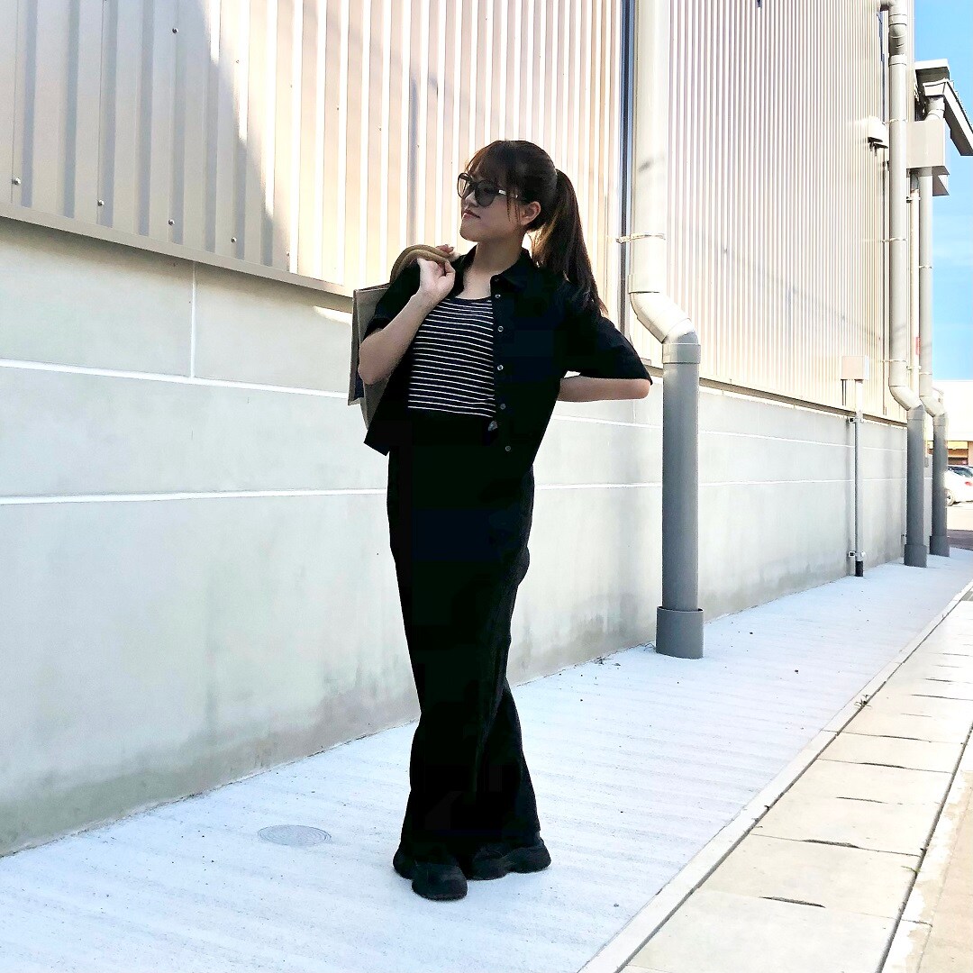 黒で統一し、ネイビーボーダーのタンクトップがポイントの、