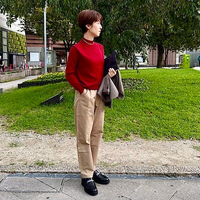 デニムシャツの襟や袖をニットから少し覗かせることで、こなれ感が出て奥行きのあるスタイリングに