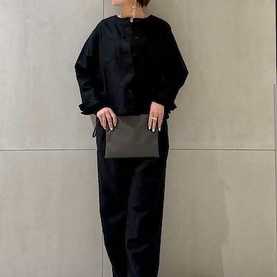黒のシューズで足元を締めることで、カジュアルながらもバランスの取れたスタイリングに仕上げています。