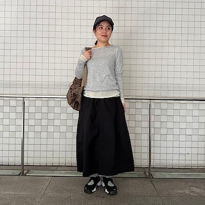 ヌメ革のミニトートバッグがコーデにさりげないアクセントを添え、ナチュラルカラーでまとめた統一感のあるワントーンコーデに仕上げました。