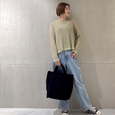 透かし編みワイドセーターの軽やかさと、ほんのりした肌見せが春〜初夏らしい涼しさを演出。