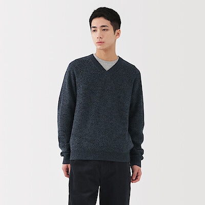 紳士 ウールミドルゲージ畦編みVネックセーター 紳士S・スモーキーブルー