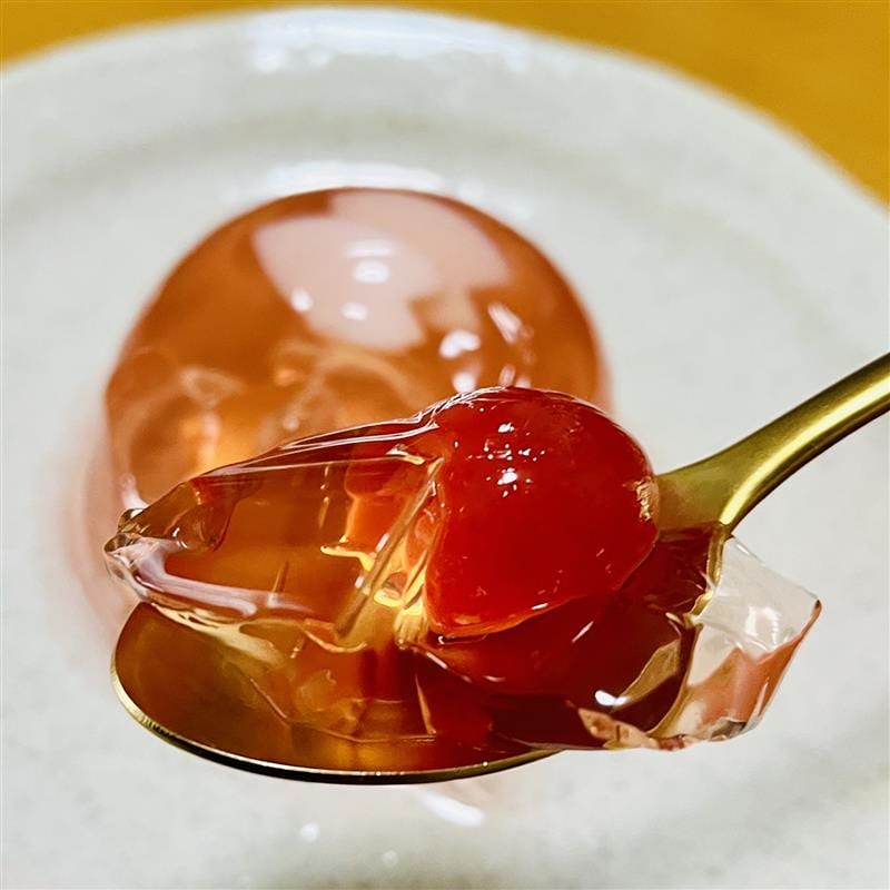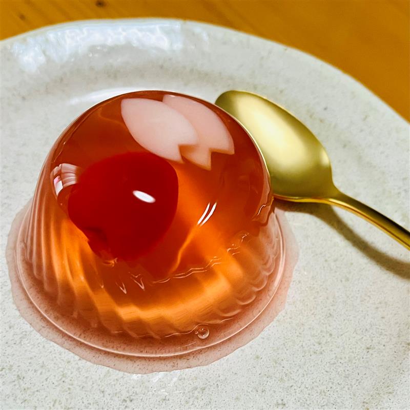 最初に紹介させていただくのは桜ゼリーです。こちらのゼリーはゼリーの中にさくらんぼが1粒入っているのも大きな特徴です。桜の優しい風味が鼻から抜ける感じがあるものの桜が主張しすぎることはないため上品な味わいとなっています。ぜひ一度ご賞味ください。