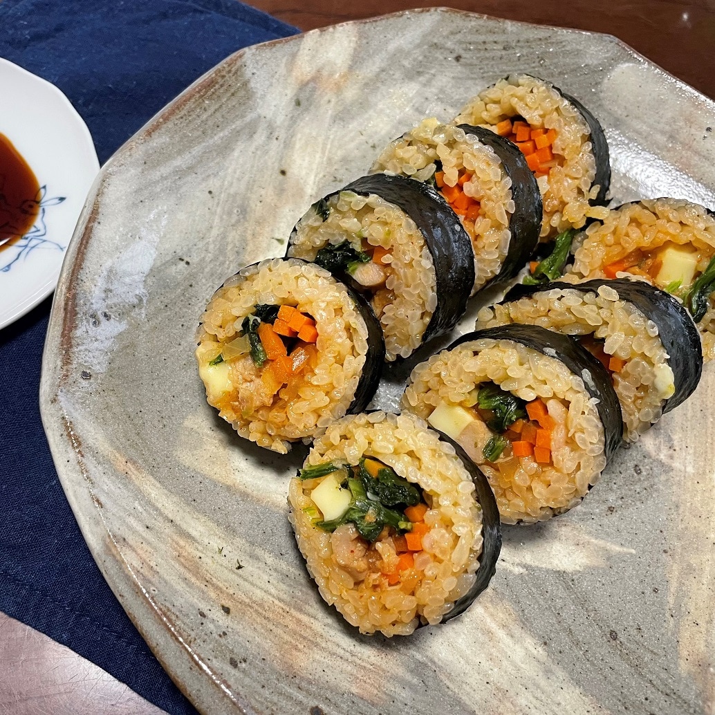 コチュジャン入りのソースで和えた鶏肉などをピリ辛のタレを合わせたごはんで巻きました。