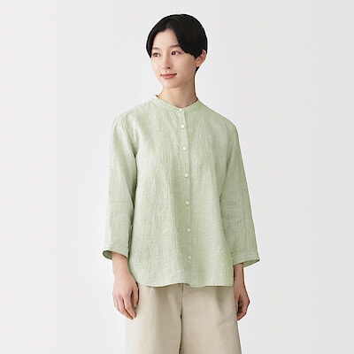 婦人 リネン 洗いざらし 七分袖ブラウス 婦人S・ライトグリーンストライプ