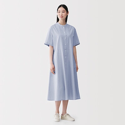 婦人 涼感 半袖シャツワンピース 婦人M・サックスブルーストライプ