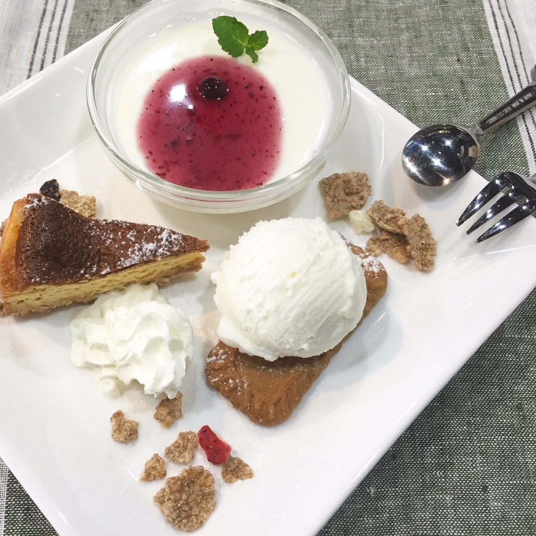 スイーツで人気の「ミニスイーツプレート」には、ミルクジェラート、甘さ控えめの手作りベイクドチーズケーキやミルクプリンがセットになっています。