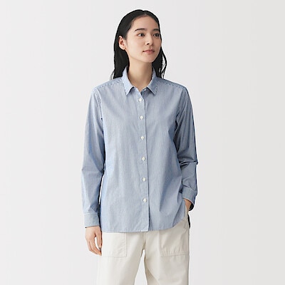 商品名:『婦人 洗いざらし ブロードレギュラーカラー長袖シャツ』 着用サイズ:婦人M 着用カラー:ダークネイビーストライプ