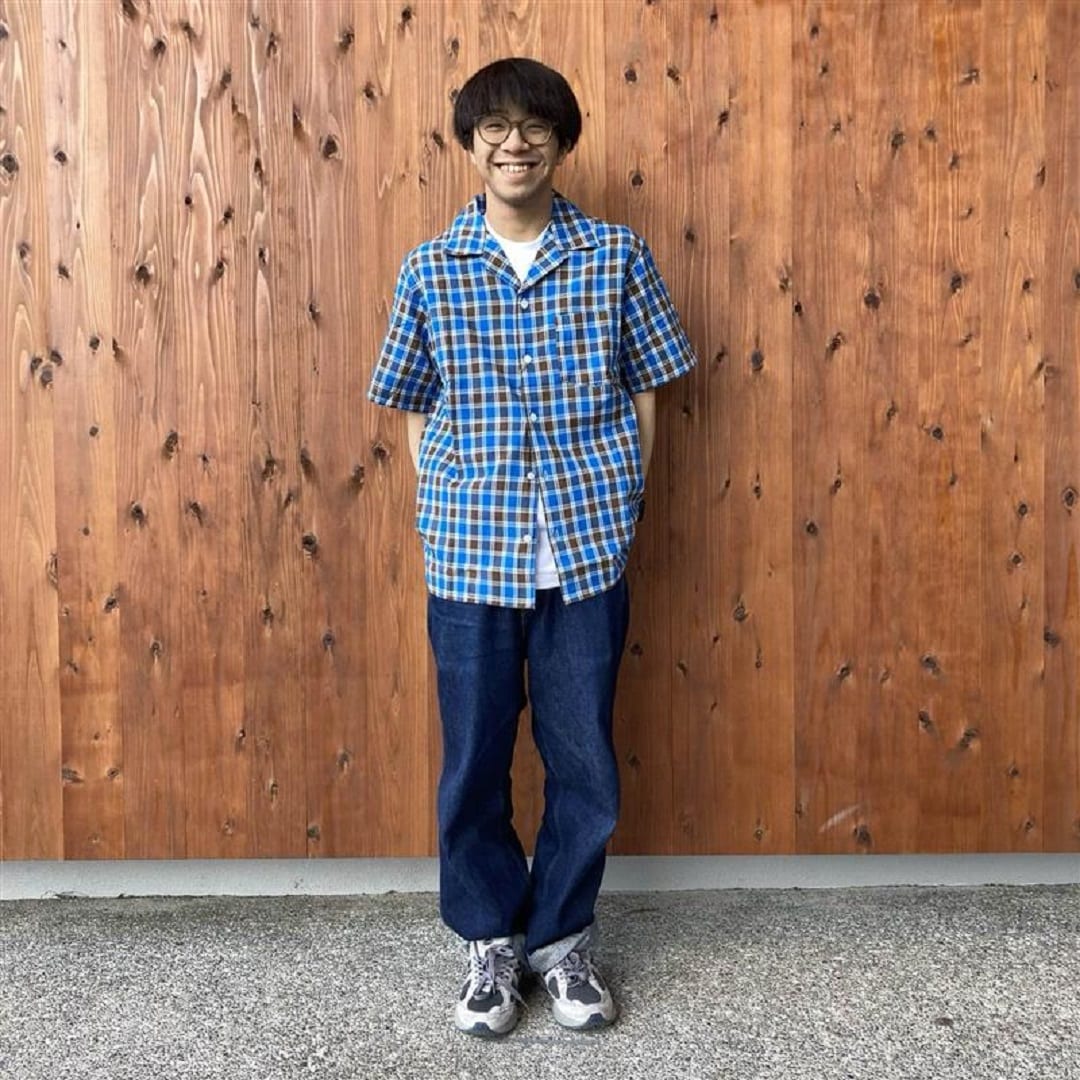 紳士 マドラスチェックオープンカラー半袖シャツ 紳士L・ブルーチェック