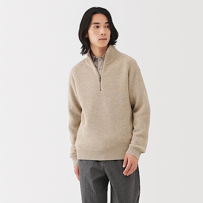紳士 ウールミドルゲージ畦編みハーフジップセーター 紳士M・オートミール