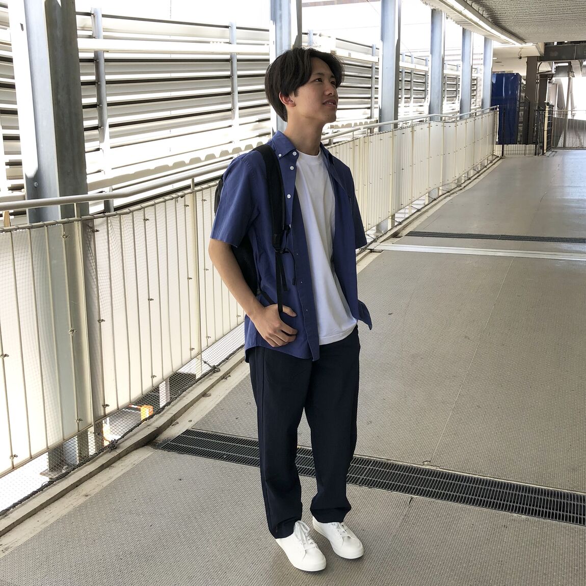 シンプルな白Tシャツと半袖シャツを重ね着し、寒色でまとめた爽やかなコーディネートです。
