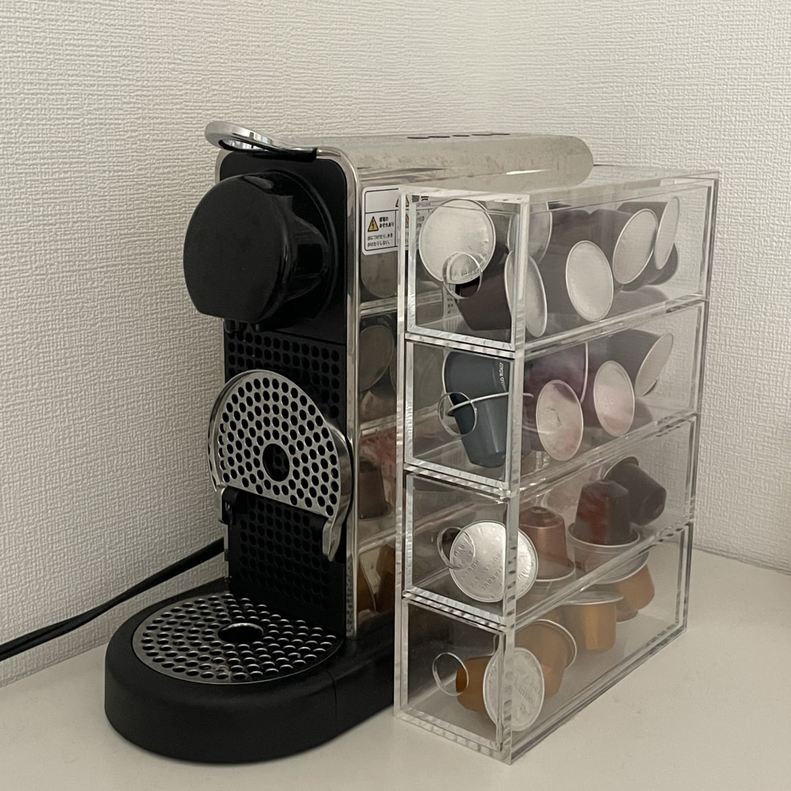 商品の名前の通りに、メガネケースや小物の収納に使えます。ブルメール舞多聞のスタッフはコーヒーカプセルの収納に使用しています。4段のため、4種類のカプセルを入れています。ちょうどいい大きさなので、すごく使いやすいです。