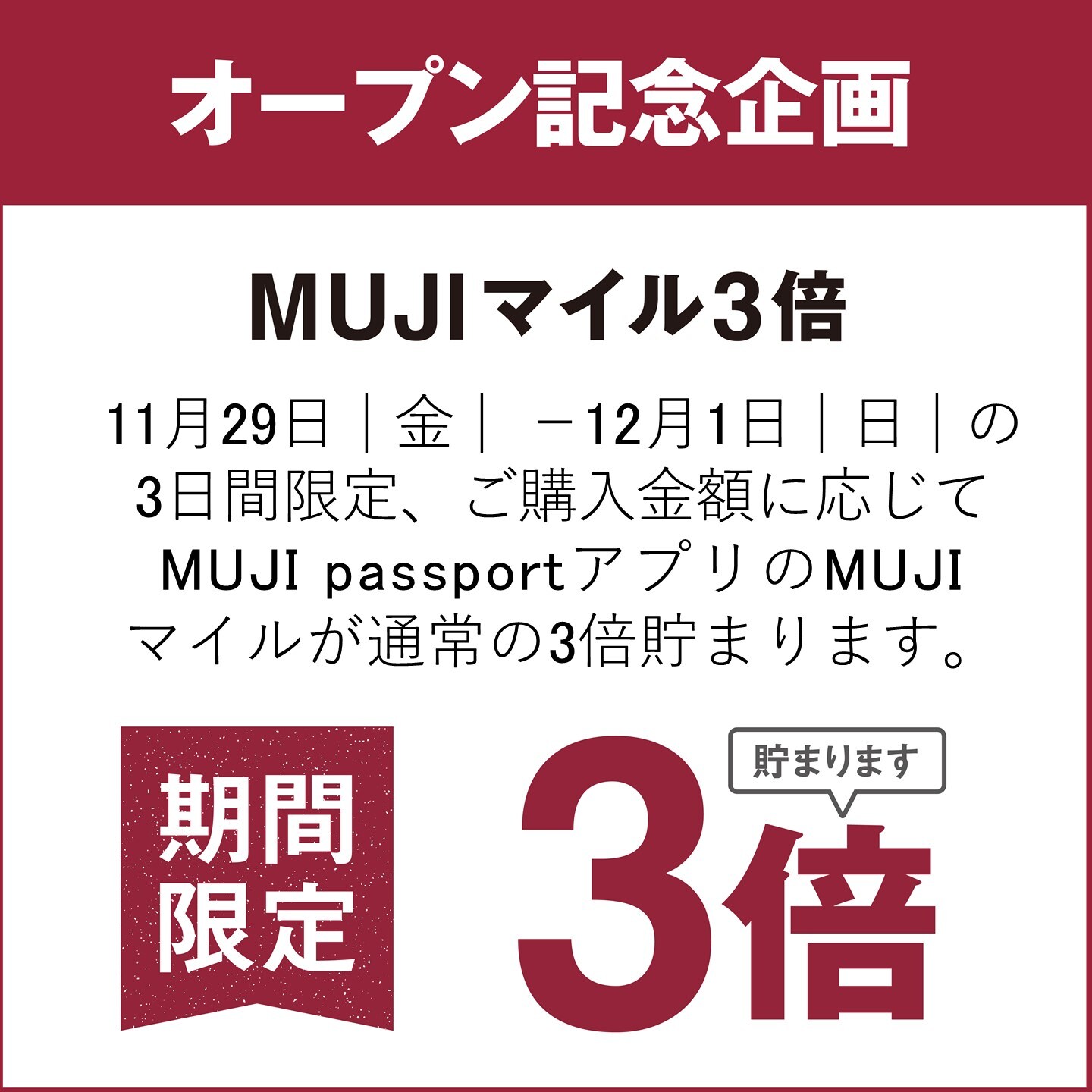 11月29日(金)~12月1日(日)の期間中、レジでMUJI passportアプリをご提示いただきご購入いただいたお客様へ、ご購入金額に応じてMUJIマイルを通常の3倍プレゼントします。