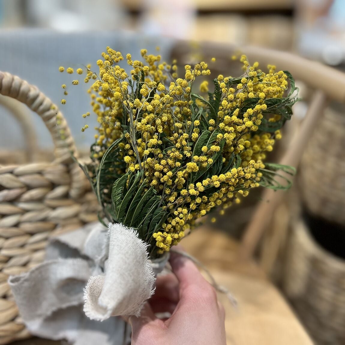 まるで陽光を閉じ込めたような明るい黄色のミモザは、ドライフラワーになってもその美しさをキープ。 なんと、約1年もの間、お部屋を彩ってくれるんです!