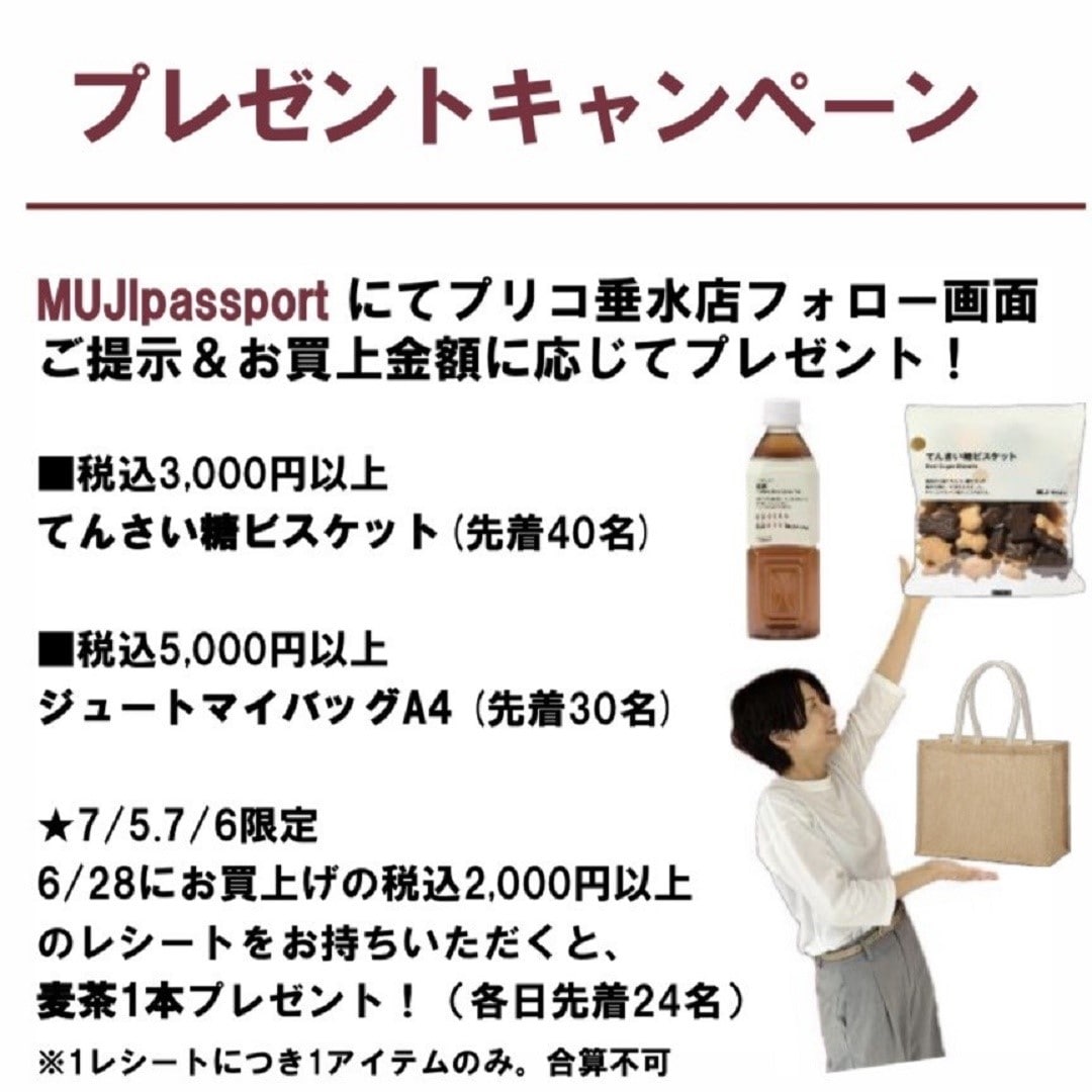 MUJIpassportにてプリコ垂水店フォロー画面ご提示&お買上金額に応じてプレゼント!