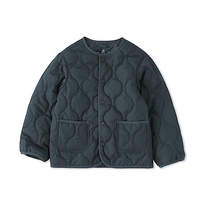キッズ『洗える中わた撥水キルトジャケット』を使用したコーディネートを紹介します。首元がすっきりしたノーカラー仕様で、マフラーやハイネックなど色々なアイテムと合わせやすく、様々なコーディネートが楽しめます。ご家庭の洗濯機でも洗えるので、お手入れも気軽にしていただけます。