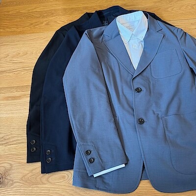 ダークネイビーのジャージージャケットとパンツを合わせたセットアップに、グレーのウールセーターを組み合わせた上品なスタイル。ストレッチ性のある素材で動きやすく、きちんと感と快適さを兼ね備えています。