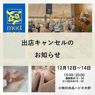 【ハピオ木野】12月14日(日)出店キャンセルのお知らせ|スウェーデン式ボディケアサロン