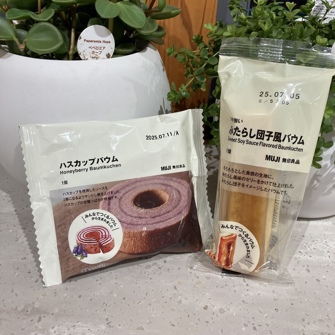 食べてみて驚いたのはバウムの食感でした。無印良品のバウムはしっとり、軽い食感のものが多いですが、こちらのバウムは、生地がもちもちしていてかなり弾力を感じました。みたらし風味のゼリーは、甘じょっぱいたれの味を見事に再現していて、もちもち食感のバウムと合わさると本物のみたらし団子のように感じられます。お団子とちがってバウムクーヘンなので、最後まで手を汚さず、おいしく頂けます。