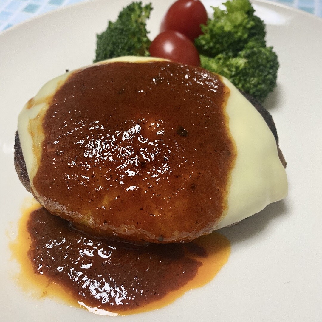 ハンバーグの上にスライスチーズをのせ、出来上がったソースをかけます。