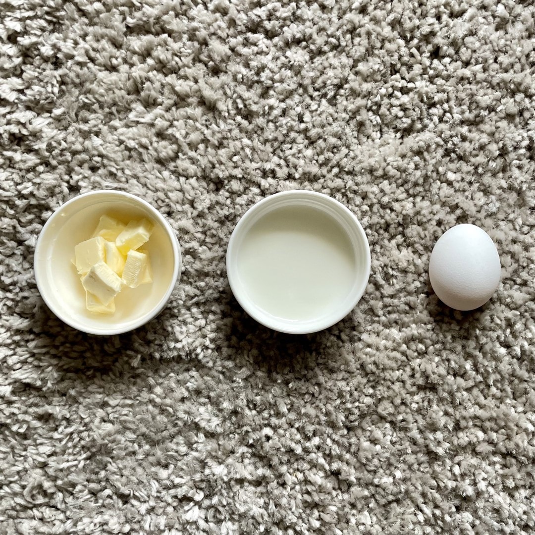 別のボウル(大きいと作業しやすいです)に卵を入れ、泡だて器でかき混ぜます。