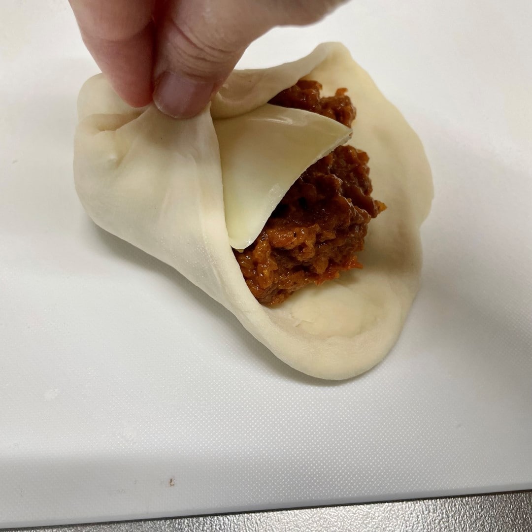 6.真ん中にそれぞれ3等分したタネをおいて包んでいきます。(トマトのキーマにはチーズを入れています)まわりの生地を中心に持ってくると包みやすいです。最後に指で生地どうしをひっつけるようにぎゅっとつまみます。