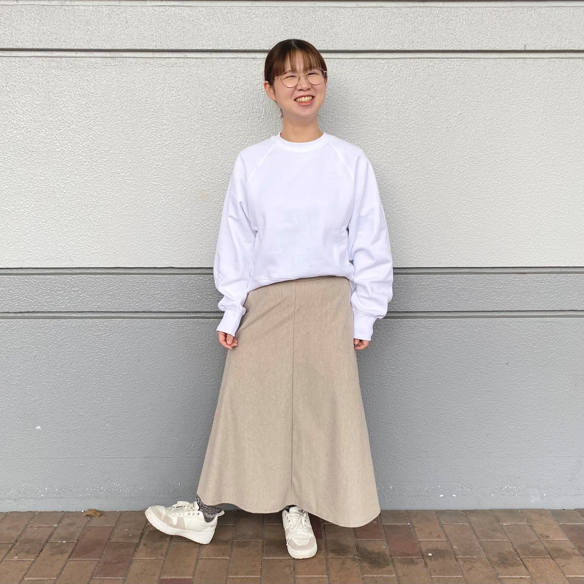 重ね着せず、1枚で着てみました。フレアスカートも相まって軽やかでさわやかなコーディネートです。