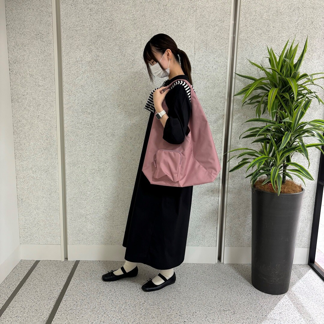ピンクのショルダーバッグが差し色になり、明るい印象にもなります!