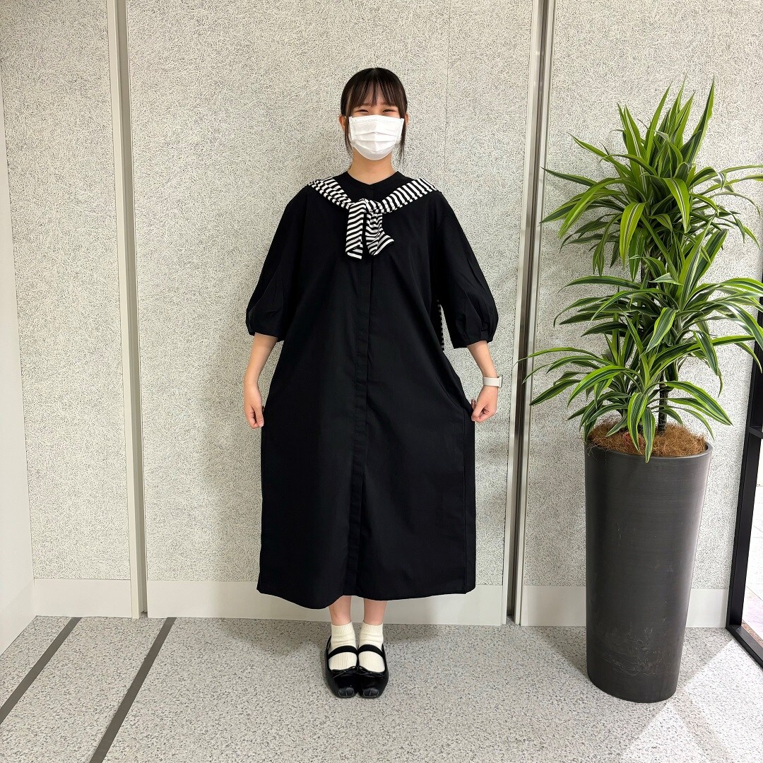 ワンピースは黒でシンプルですが、ボーダーシャツを合わせることでカジュアルになり、アクセントにも◎
